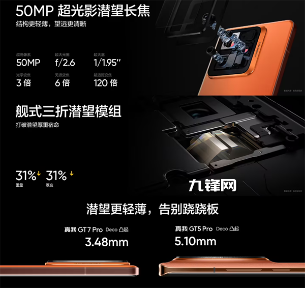 真我GT7 Pro采用領(lǐng)先行業(yè)的艦式三折射潛望模組設(shè)計,大幅減薄原本厚重的潛望結(jié)構(gòu),Deco凸起僅有3.48毫米,讓輕薄潛望成為可能。