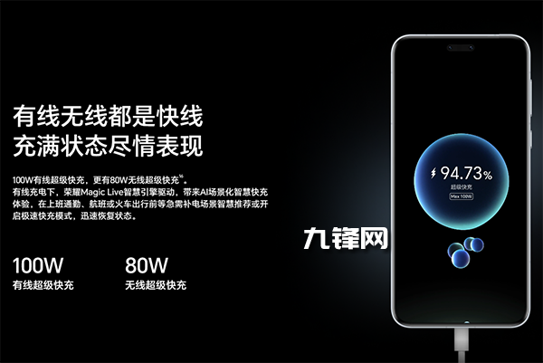 充電方面,該機也是延續(xù)了榮耀在快充方面的優(yōu)勢,這一代搭載的是100W的有線快充和80W的無線快充。