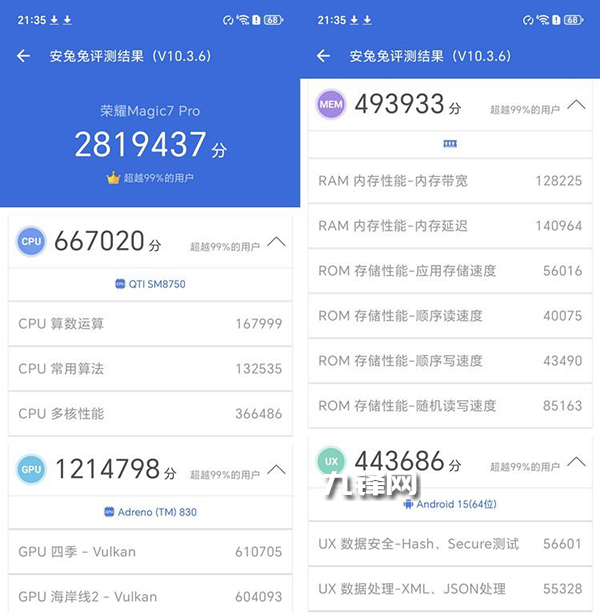 我們手頭這臺16GB+1TB的Magic7 Pro,在安兔兔評測中跑出了281萬9437分的綜合成績。