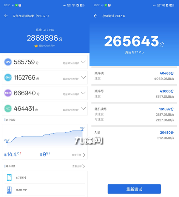 在跑分方面,這個(gè)真我GT7 Pro跑分高達(dá)286萬(wàn)分,一舉超越此前驍龍8Gen3,而在閃存部分,隨機(jī)讀寫(xiě)相比此前驍龍8 Gen3也有了大幅度提升,讀取來(lái)到了4069MB/S、寫(xiě)入來(lái)到了3747.3MB/S。