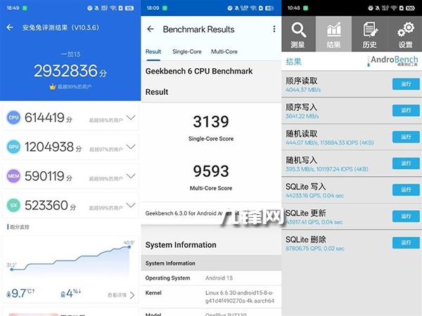 安兔兔綜合性能測(cè)試,總成績(jī)突破了293萬(wàn)分,同比上一代搭載驍龍8 Gen3的一加12綜合性能提升了約38.5%,其中CPU成績(jī)614419分,同比提升了31%,GPU成績(jī)?yōu)?204938分,同比提升了34.2%。
