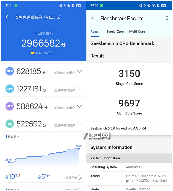 296萬分,一加13搭載的是驍龍8至尊版處理器,性能跑分在296萬左右,GeekBench 6的單核成績?yōu)?150分,多核成績?yōu)?697分,目前屬于是旗艦級別的性能水平。