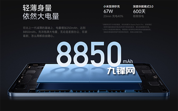 也就是說,小米平板Pad7 Pro配置的是8850mAh電池容量,支持的是67W的有線快充。