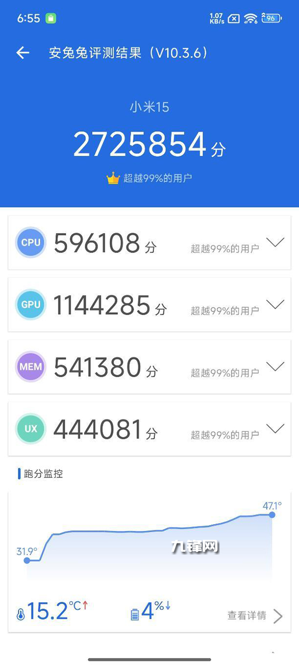 在安兔兔性能跑分測試中,機(jī)身31.9度,開啟性能模式,小米15最終成績?yōu)?725854分。