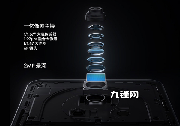 使用了雙攝方案,后置一億像素主攝(三星S5KHM6s,1/1.67英寸,6P鏡頭)+200萬像素景深鏡頭,主攝等效焦距23.62mm,支持9合1等效1.92μm融合像素,前置800萬像素攝像頭。