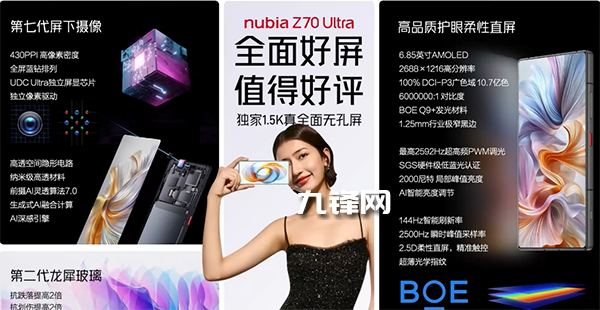 努比亞Z70 Ultra屏幕參數(shù):尺寸是6.85英寸,分辨率是2688×1216(屬于是1.5K級別),供應(yīng)商是京東方,Q9+發(fā)光材質(zhì)的OLED柔性直屏,(實測手動亮度664nit,全局峰值亮度1560nit),局部峰值亮度2000nit,支持144Hz刷新率,2500Hz瞬時觸控采樣率,低亮度2592Hz的PWM高頻調(diào)光+高亮度類DC調(diào)光,10bit色深,100% DCI P3色域,430PPI,UDC Ultra獨立屏顯芯片,第二代龍犀玻璃(GG7i),1.25mm窄黑邊,匯頂高位超薄指紋;