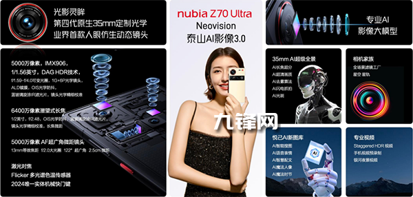 超廣角鏡頭改為13mm等效焦距,不過(guò)OIS防抖被砍,努比亞Z70 Ultra機(jī)身側(cè)面有實(shí)體快門(mén)鍵,影像功能增加了多項(xiàng)AI玩法,比如AI超級(jí)全景、AI光斑、AI語(yǔ)音修圖等。