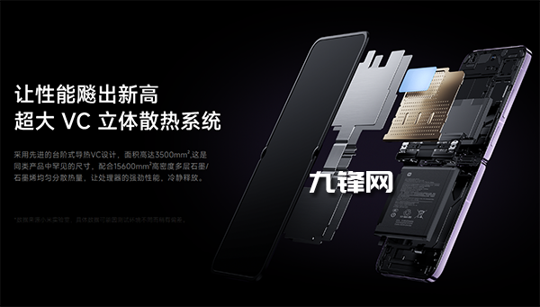 大家關(guān)心的散熱方面,小米MIX Flip具備臺(tái)階立體散熱,臺(tái)階立體散熱的VC面積高達(dá)3500mm2,VC對(duì)于SOC部分下沉0.3mm,直觸熱源,而在轉(zhuǎn)軸處還是用兩層石墨使得它的導(dǎo)熱能力提升30%,另外在臺(tái)階位置還是用氣凝膠填充,讓它隔絕了SOC熱量傳遞到內(nèi)屏。