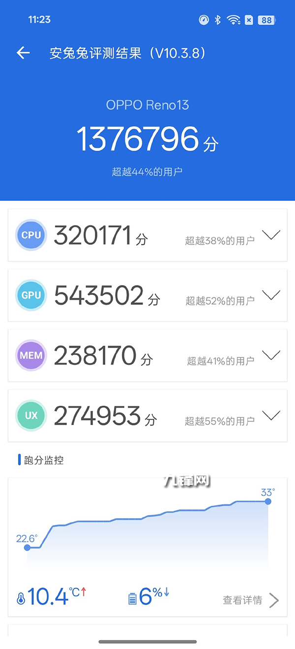 實(shí)測(cè)我們手上這臺(tái)12GB+256GB版本的OPPO Reno13在安兔兔跑分中可以達(dá)到137萬(wàn)分,非常接近天璣9200機(jī)型的跑分。