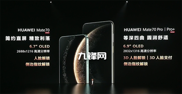華為Mate70 Pro、Mate70 Pro+采用6.9英寸OLED等深四曲屏,分辨率為2832×1316,支持3D人臉解鎖、3D人臉支付和側(cè)邊指紋解鎖。并首發(fā)高亮鈦玄武機(jī)身,相比Mate60 Pro+耐摔能力提升1倍,搭配亮面弧度中框。華為Mate70系列全系采用第二代昆侖玻璃,整機(jī)耐摔能力相比普通玻璃提升20倍。