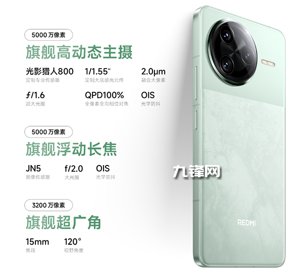 主攝像頭:5000萬像素,光影獵人800傳感器,1/1.55英寸,OIS光學(xué)防抖,F(xiàn)1.6光圈,等效焦距24mm,4in1 2.0μm融合像素,6P鏡頭