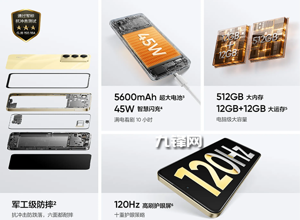 其它:沒有NFC和紅外遙控,但支持IP68+IP69防塵防水、軍工級防摔、Wi-Fi5、側邊指紋識別、單揚聲器,最高2TB存儲卡擴展,無網(wǎng)暢聊,搭載realmeUI5.0,內(nèi)置親情守護模式。