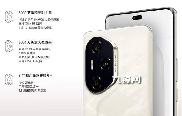 在相機(jī)的配置上,這個榮耀300 Pro后置5000萬像素雅顧光影主攝,OIS+EIS 防抖,另外還有一個5000萬像素長焦人像鏡頭,支持3倍光學(xué)變焦,OIS+EIS 防抖,再一個就是112° 超廣角微距鏡頭,2.5cm微距,再加上前置5000萬像素單反級鏡頭,f/2.1 大光圈。