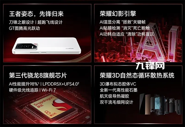 核心方面,該機(jī)搭載3.3GHz主頻驍龍8Gen3處理器+LPDDR5X內(nèi)存+UFS4.0閃存的性能組合,輔以榮耀幻影引擎,首創(chuàng)3D瀑布擬態(tài)腔體VC與行業(yè)首創(chuàng)的雙干流毛細(xì)網(wǎng)設(shè)計(jì),首發(fā)AI渲顯分離技術(shù)等保證性能釋放。