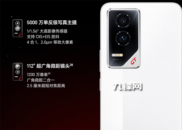 影像方面,榮耀GT搭載了5000萬像素主攝(索尼IMX906傳感器,1/1.56英寸,f/1.95,支持OIS+EIS)+1200萬超廣角攝像頭(f/2.2,2.5cm最近對焦距離,112°視場寬度)+1600萬像素前置攝像頭(f/2.45)。