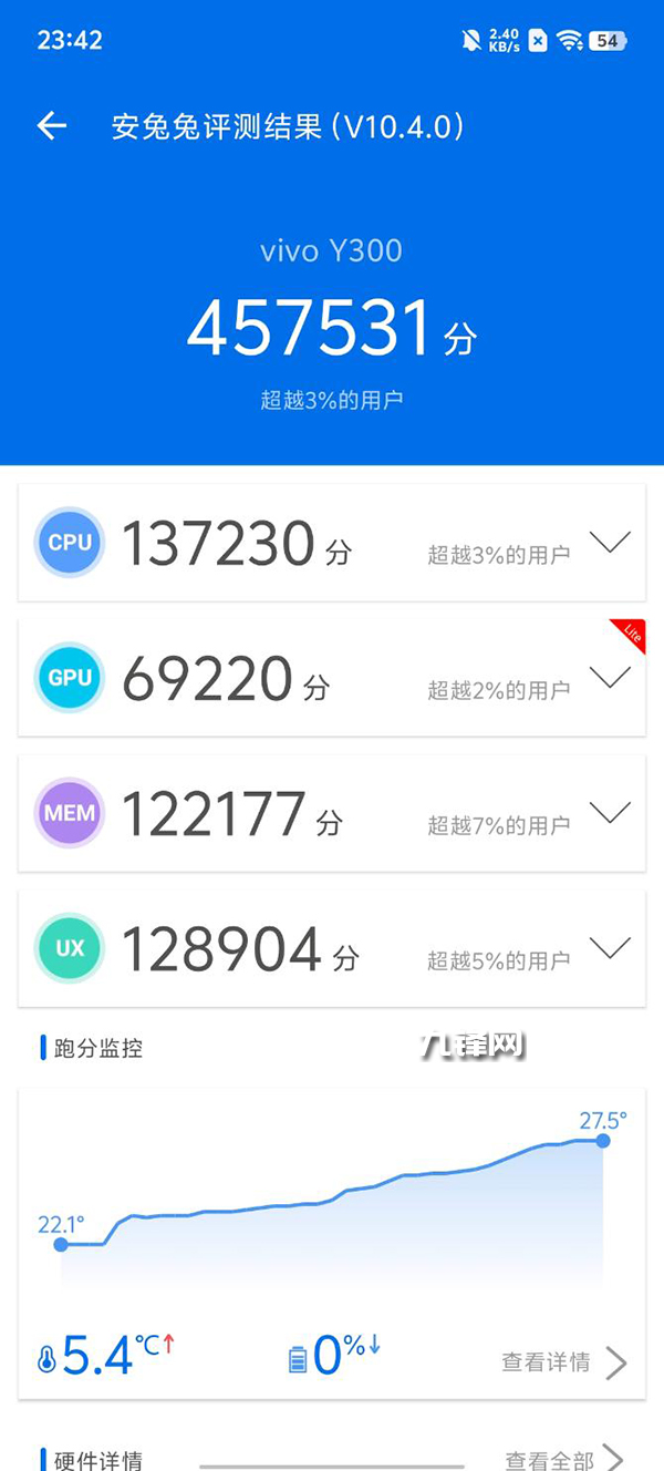 顯然,天璣6300并不是一顆主打性能的處理器,在安兔兔V10版本中,vivo Y300跑分成績?yōu)?57531分,其中CPU得分137230分,GPU得分69220分,MEM得分122177分,UX得分128904分。