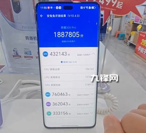 188萬(wàn)分,榮耀300 Pro搭載的是殘血版(也就是降頻版)的驍龍8Gen3處理器,根據(jù)安兔兔軟件的測(cè)試,跑分在188萬(wàn)左右,屬于是中高端級(jí)別的性能水平。