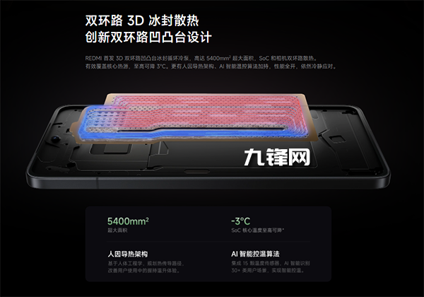 雙環(huán)路3D冰封散熱,5400平方毫米的大VC導(dǎo)熱速度更快。