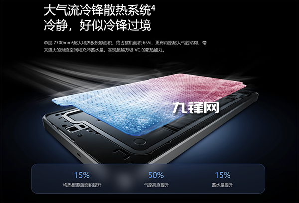 大氣流冷鋒散熱系統(tǒng),真我Neo7手機(jī)搭載大氣流冷鋒散熱,挑戰(zhàn)行業(yè)最大VC覆蓋面,單VC面積高達(dá)7700mm2,70%超廣域覆蓋,采用超大氣腔結(jié)構(gòu),蓄水量增加15%,配有高性能導(dǎo)熱凝膠,散熱能力提升85%。