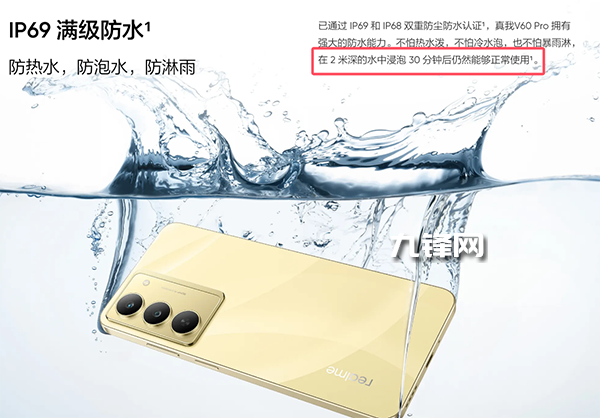 也就是說(shuō),realme真我V60 Pro通過(guò)IP69和IP68 雙重防塵防水認(rèn)證擁有強(qiáng)大的防水能力,不怕熱水潑,不怕冷水泡,也不怕暴雨淋,并且在2米深的水中浸泡30分鐘后仍然能夠正常使用。