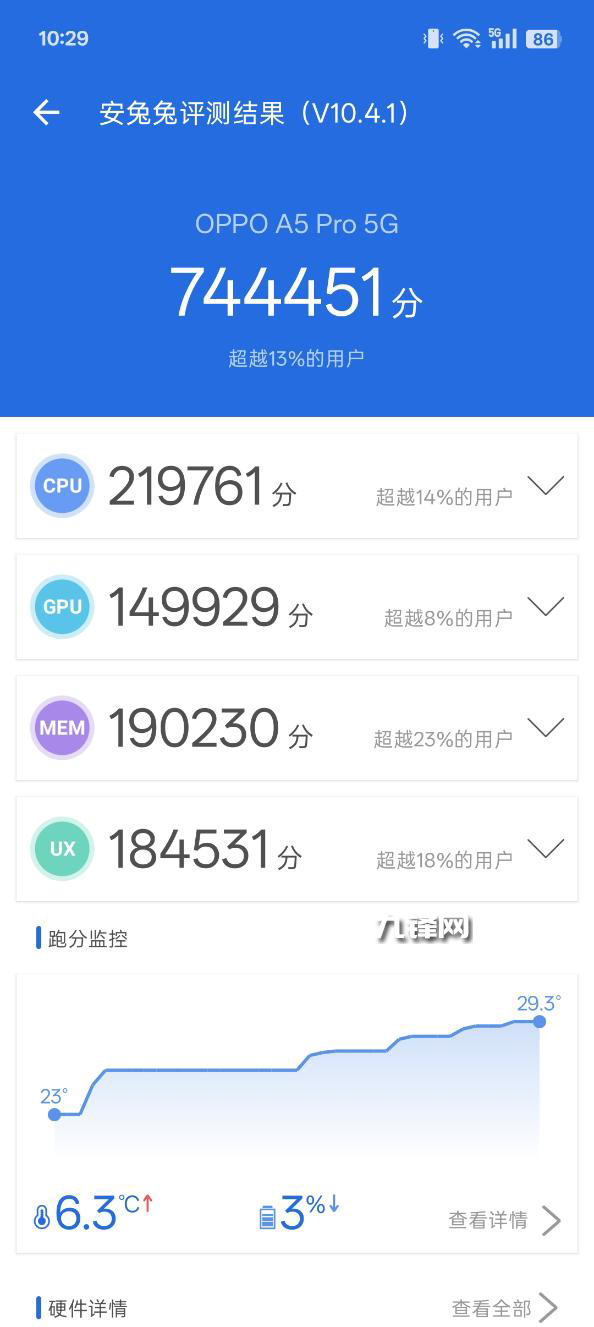 74萬分,OPPO A5 Pro搭載的是臺積電4納米工藝的天璣7300處理器,基于安兔兔V10.4.1版本進行跑分測試,成績?yōu)?44451分,對比現(xiàn)在的旗艦處理器,這個性能跑分屬于是中低端級別的性能水平了。