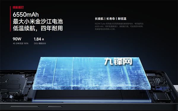 續(xù)航可以說是Turbo4的一大撒手锏,6550mAh的小米金沙江電池,配上90W快充,官方宣稱在標準環(huán)境下按一天一充使用4年后,電池剩余容量還能有80%,即便在-35°C的超低溫環(huán)境,憑借雙增壓耐寒芯片也能正常使用,冬季續(xù)航短板被徹底補齊。
