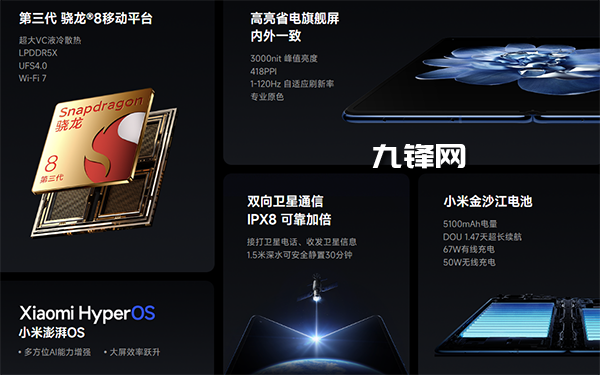 MIX Fold4外屏用上了小米龍晶玻璃,抗摔性能相比傳統(tǒng)玻璃提升10倍。內(nèi)屏采用UTG超薄玻璃,強度是傳統(tǒng)CPI的2.25倍,確保屏幕在長期彎折之后的平整度和耐用性,同時,它也首度在MIX Fold系列上實現(xiàn)了IPX8級別防塵抗水。