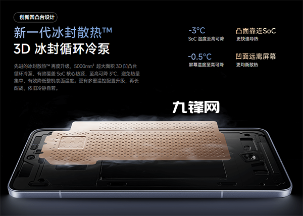 采用了全新3D冰封散熱系統(tǒng),通過(guò)創(chuàng)新凹凸臺(tái)設(shè)計(jì),凸面更貼近處理器,使SoC核心溫度相比上代最高降低3°C,凹面遠(yuǎn)離屏幕,屏幕溫感更低。
