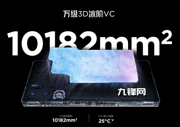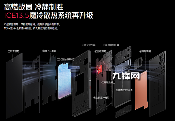 對(duì)于游戲手機(jī)來(lái)說(shuō),散熱性能至關(guān)重要,紅魔9S Pro系列的魔冷散熱系統(tǒng)從上代的ICE13.0升級(jí)到ICE13.5,主要變化就是CPU表面加入了全新的霜冷凝膠,其他諸如離心風(fēng)扇,全貫穿式風(fēng)道,10182平方毫米的3D VC均熱板都保持不變。