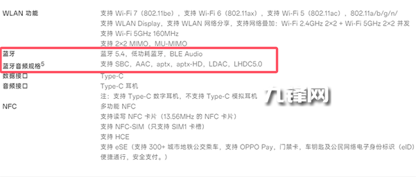 藍(lán)牙方面,該機(jī)配置的是藍(lán)牙5.4,低功耗藍(lán)牙,BLE Audio,并且支持SBC,AAC,aptx,aptx-HD,LDAC,LHDC5.0這些藍(lán)牙音頻規(guī)格。