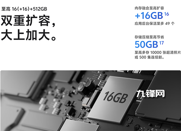 存儲(chǔ)方面,最高提供16GB+512GB的存儲(chǔ)組合,額外提供16GB運(yùn)存拓展,共計(jì)32GB運(yùn)存,通過內(nèi)存融合技術(shù),可以讓手機(jī)更加流暢。