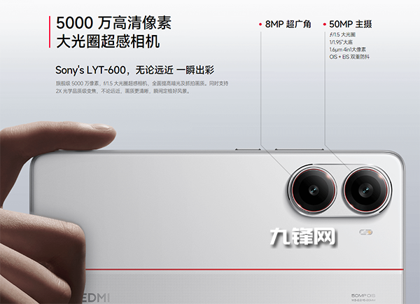 在影像的配置上,其主攝為索尼5000萬像素LYT-600主攝,擁又1.6um融合大像素,同時配備f/1.5光圈+OIS光學(xué)防抖。另外一顆攝像頭則是為120°可視角度的800萬像素超廣角鏡頭。