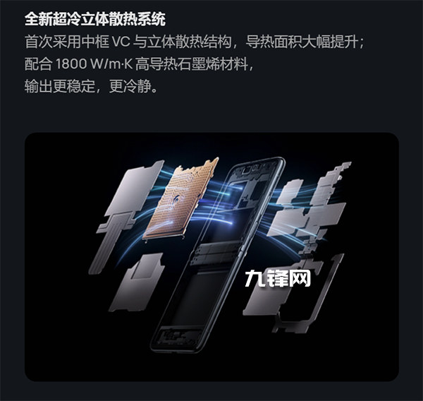 散熱上,采用了全新超冷立體散熱系統(tǒng),業(yè)界首創(chuàng)中框VC+立體散熱結(jié)構(gòu) ,并且采用業(yè)界最高導(dǎo)熱石墨烯材料,等效導(dǎo)熱系數(shù)達(dá)1800W/m·K,整體導(dǎo)熱面積提升80%。