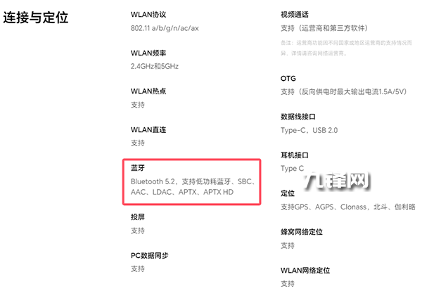 藍(lán)牙方面,該機(jī)支持藍(lán)牙5.2,并且支持低功耗藍(lán)牙、SBC、AAC、LDAC、APTX、APTX HD。