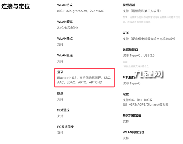 藍牙方面,該機配置的是藍牙5.3,并且支持低功耗藍牙、SBC、AAC、LDAC、APTX、APTX HD。