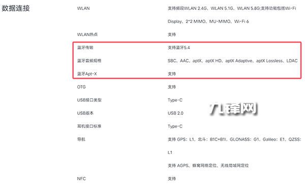 藍(lán)牙方面,該機(jī)配置的是藍(lán)牙5.4,并且支持SBC、AAC、aptX、aptX HD、aptX Adaptive、aptX Lossless、LDAC這些音頻規(guī)格。