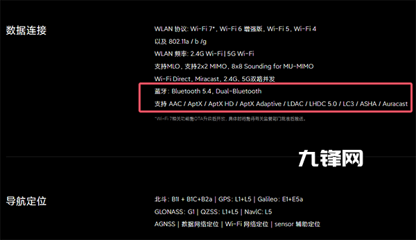 藍牙方面,該機配置的是藍牙5.4,Dual-Bluetooth,音頻規(guī)格上支持AAC/AptX/AptX HD/AptX Adaptive/LDAC/LHDC5.0/LC3/ASHA/Auracast。