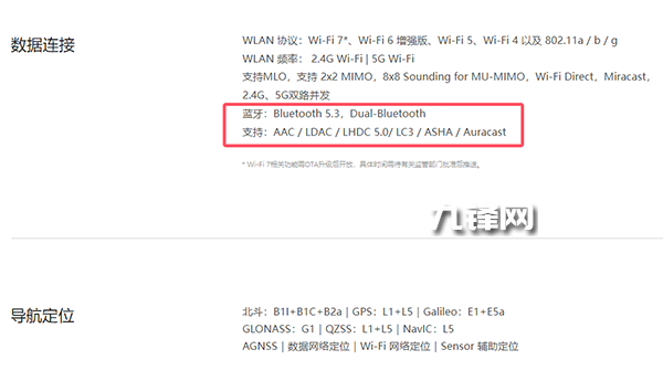 藍牙方面,該機配置的是藍牙5.3,Dual-Bluetooth,音頻規(guī)格上支持:AAC/LDAC/LHDC 5.0/LC3/ASHA/Auracast。