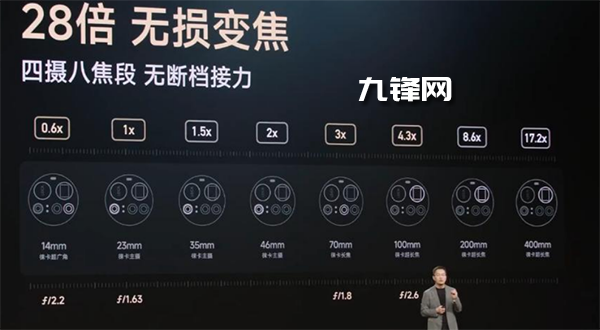 在焦段方面,有14mm(超廣角)、23mm(主攝)、35mm(主攝)、46mm(主攝)、70mm(直立長(zhǎng)焦)、100mm(潛望式長(zhǎng)焦)、200mm(潛望式長(zhǎng)焦)、400mm(潛望式長(zhǎng)焦)。