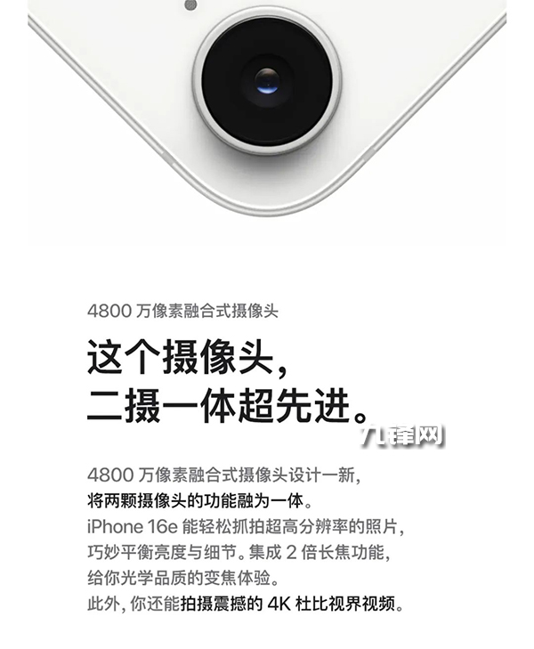 沒(méi)想到,在2025年竟然還有單攝像頭的手機(jī)出現(xiàn)。蘋(píng)果可能也覺(jué)得這事兒不太合適,所以在自己的頁(yè)面上大字強(qiáng)調(diào):俺這是“二攝一體”的融合式攝像頭,其實(shí)這就是iPhone16主攝的同款4800萬(wàn)像素的傳感器。