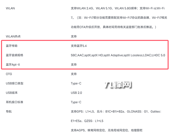 藍(lán)牙,該機(jī)配置的是藍(lán)牙5.4,音頻規(guī)格上支持SBC、AAC、aptX、aptX HD、aptX Adaptive、aptX Lossless、LDAC、LHDC 5.0。