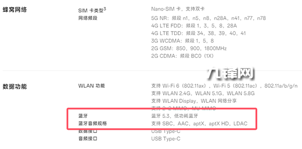 藍(lán)牙方面,該機(jī)配置的是藍(lán)牙5.3,低功耗藍(lán)牙,藍(lán)牙音頻規(guī)格上支持SBC,AAC,aptX,aptX HD,LDAC。