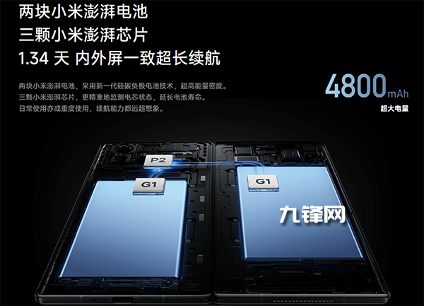 鑒于折疊屏獨(dú)特的性質(zhì),小米MIX Fold3可以搭載兩塊澎湃電池和3顆自研澎湃系列芯片,兩顆澎湃G1用于精準(zhǔn)計(jì)算電池放電數(shù)據(jù),一顆澎湃P1提供穩(wěn)定的電量輸入。