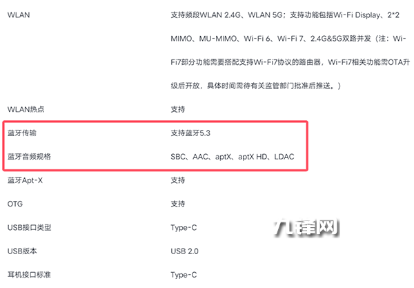 藍(lán)牙方面,該機(jī)支持的是藍(lán)牙5.3,音頻規(guī)格上支持SBC、AAC、aptX、aptX HD、LDAC。