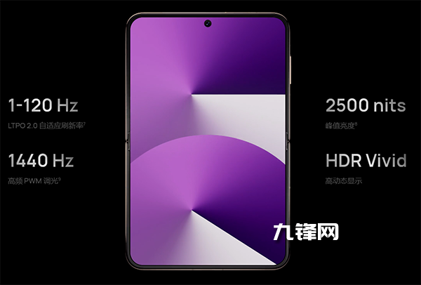 具體來看,它配置的是3.5英寸的OLED外屏,分辨率為980×980,支持1-120Hz LTPO 2.0自適應(yīng)刷新率,1440 Hz高頻PWM調(diào)光,最高240Hz觸控采樣率,支持顯示10.7億色以及P3廣色域,局部峰值亮度2500nit。