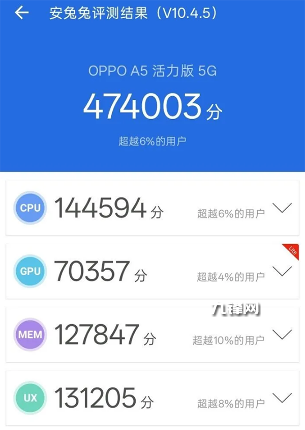 也就是說,OPPO A5活力版搭載的是聯(lián)發(fā)科天璣6300處理器,最高主頻2.4GHz,整機(jī)在安兔兔中的性能跑分是47.4萬左右。
