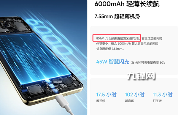 801Wh/L,realme真我14 Pro搭配的是6000mAh泰坦電池,能量密度在801Wh/L左右,并且支持45W的智慧閃充。