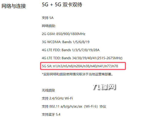 5G頻段SA: n1/n3/n5/n8/n28A/n38/n40/n41/n77/n78。