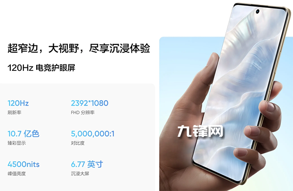 屏幕:6.77英寸,OLED曲面屏,分辨率2392×1080,120Hz高刷新率,180Hz觸控采樣率,全局默認最高亮度600nit(設置欄可增大亮度至800nit),全局激發(fā)最高亮度1400nit,局部峰值最高亮度4500nit,小于等于70nit亮度是3840Hz高頻PWM調光,大于70nit時是DC調光,10.7億色顯示,100% DCI-P3色域,屏占比93.7%。