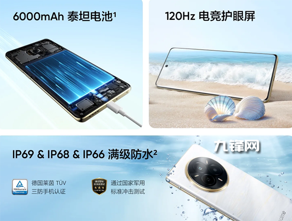 其它:支持IP69+IP68+IP66滿級防水,WiFi6、藍牙5.4、NFC、超線性雙揚聲器,屏下光學短焦指紋、出廠搭載realmeUI6.0。